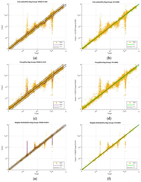 Table 6 summarizes the RMSE on the experimental test set under the three learning strategies. Each row corresponds to a specific parametric HD method using its optimal model order determined in the simulation. The Steiglitz–McBride method consistently yields the lowest RMSE, achieving a minimum of 0.0279 when trained solely on experimental data due to its focused exposure to limited conditions. The Yule–Walker method also demonstrates competitive performance, particularly under the hybrid learning strategy, with RMSE values approaching those of the Steiglitz–McBride method. Prony, on the other hand, shows slightly higher RMSE in all cases, indicating comparatively lower generalization capability. However,