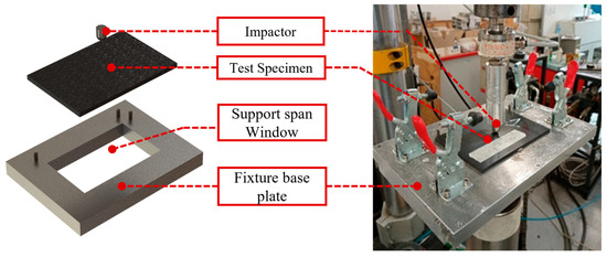 Proper alignment was ensured using three guide pins that facilitated the accurate centring of the plate. In this study, the plates were tested in a simply supported configuration. A steel hemispherical impactor, with a diameter of 12.7 mm, was used to apply the load at a constant displacement rate of 1 mm/min. Load and displacement data were recorded continuously throughout the experiment. To ensure the reliability and consistency of the results, tests were conducted on three specimens for each stacking sequence, all under identical experimental conditions.