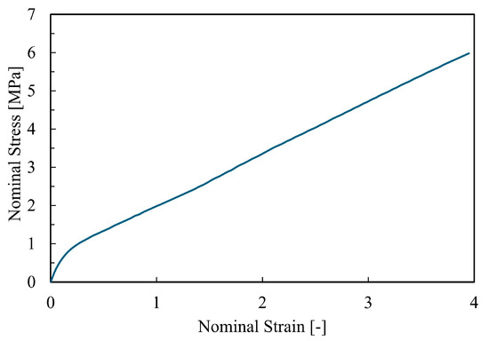 Several strain energy potentials in Abaqus/Standard (including Neo-Hookean [54], Yeoh [55], Arruda–Boyce [56], and Marlow [57]) were preliminarily assessed for numerical stability. Based on previous investigations [12,58], the Marlow model was selected for its ability to capture the response of rubber materials with high accuracy. This phenomenological, data-driven formulation derives the deviatoric behaviour directly from the results of tensile tests (Figure 3), interpolated as a function of the first deviatoric strain invariant. The strain energy density is expressed as follows: