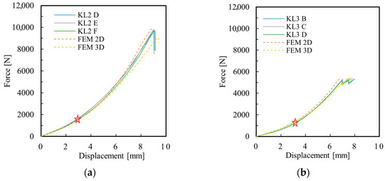 Experimental and numerical load–displacement curves for (a) laminate KL2 and (b) laminate KL3, with the divergent point from the numerical models highlighted in red.
