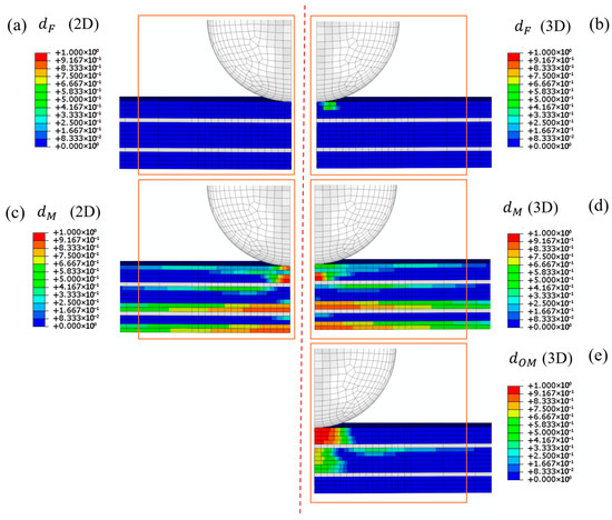 In-plane matrix damage, shown in Figure 6c,d, is minimal at this stage and exhibits a similar distribution in both the 2D and 3D damage models. However, as illustrated in Figure 6e, the out-of-plane matrix damage parameter, defined only in the 3D model, reached a value of one in some elements within the first three volumes. These findings confirm that the 3D damage model is more effective at capturing the initiation of out-of-plane failure, although it has reduced stiffness during its progression.