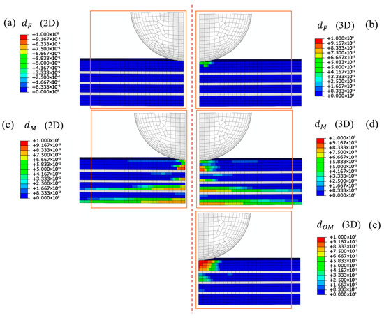 The simulations using the 2D and 3D approaches exhibit distinct trends for both the KL2 and KL3 laminates, as depicted in Figure 4. The Hashin 2D failure model consistently demonstrates greater stiffness compared to the average experimental load–displacement curves (see Figure 4a,b), predicting peak forces up to 1% higher for the KL2 laminate (9841 N vs. 9731 N). In contrast, the 3D model exhibits greater compliance, underestimating the peak load by approximately 7% (9032 N). For the KL3 laminate, both 2D and 3D simulations yield nearly identical results (5443 N and 5448 N, respectively), both exceeding the experimental average of 5309 N by about 3%. Although the curves for the 2D and 3D failure models overlap at lower displacements, the curves for the KL2 laminate begin to diverge at a displacement of 3.1 mm (Figure 4a). In contrast, the divergence for the KL3 laminate occurs at approximately 3 mm (Figure 4b). By critically comparing the formulas presented in Table 1, the 3D failure model accounts for out-of-plane deformations , , and , which are essential to trigger damage. Additionally, the damage evolution model in the 3D formulation includes the additional damage parameter to account for matrix degradation in the out-of-plane direction. To investigate the reasons for the discrepancy between the two models, a comprehensive analysis of the damage parameters was conducted. The simulation results for the KL2 sample at the onset of divergence in load–displacement curves are presented in Figure 5.