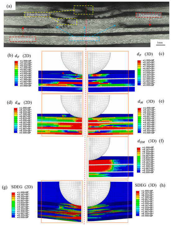 Cross-section micrographic and numerical results for sample of laminate KL2 at end of indentation. (a) Optical micrography of laminate under loading point, (b) damage parameter for fibre following 2D Hashin criteria, (c) damage parameter for fibre following 3D Hashin criteria, (d) in-plane damage parameter for matrix calculated using 2D Hashin criteria, (e) in-plane damage parameter of matrix calculated using 3D Hashin criteria, (f) out-of-plane damage parameter of matrix calculated using 3D Hashin criteria, (g) interlaminar failure within 2D Hashin model, (h) interlaminar failure within 3D Hashin model.