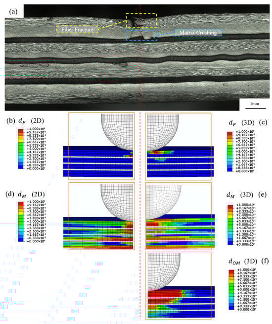 Cross-section micrographic and numerical results for sample of laminate KL3 at end of indentation. (a) Optical micrography of laminate under loading point, (b) damage parameter for fibre following 2D Hashin criteria, (c) damage parameter for fibre following 3D Hashin criteria, (d) in-plane damage parameter for matrix calculated using 2D Hashin criteria, (e) in-plane damage parameter of matrix calculated using 3D Hashin criteria, (f) out-of-plane damage parameter of matrix calculated using 3D Hashin criteria.