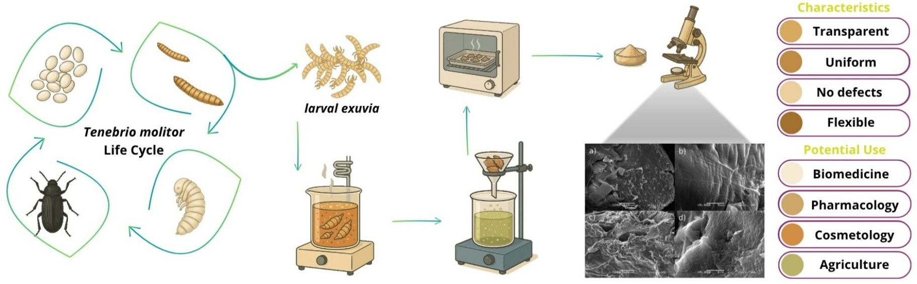 - Nafary, A.; Mousavi Nezhad, S.; Jalili, S. Extraction and Characterization of Chitin and Chitosan from Tenebrio Molitor Beetles and Investigation of Its Antibacterial Effect against Pseudomonas Aeruginosa. Adv. Biomed. Res. 2023, 12, 2–7. [Google Scholar] [CrossRef]