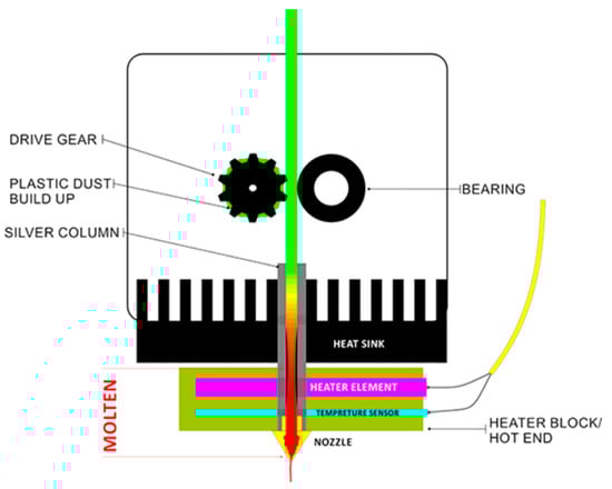 The print head is equipped with a motor that pushes the filament through the extruder. This motor is controlled by the 3D printer’s computer and precisely controls the speed and amount of material that is extruded [29,30].