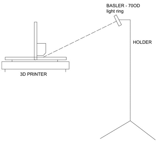 As an external light source, a Basler standard light ring (70 OD) was used to illuminate the printed area. Its location was chosen to illuminate the working area of the 3D printer without creating unwanted shadows. For this reason, we placed the light source at an angle directly above the print head from the front of the 3D printer (see Figure 7). Thanks to this lighting arrangement, all shadows fell on the scanned surface so that the print head did not interfere with the illumination of the surface being printed.