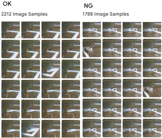 To be able to recognise the above-mentioned defects (stringing, layer shifting, non-adhesion to the surface), it was necessary to create a dataset. The dataset (Figure 8) consisted of images that captured the gradual progress of printing. For this reason, we set a Teachable Machine to take one image per second (1 fps). This gave us an extensive database of good (OK) and bad (NG) samples, which we then used to train the neural network. Since a low frame rate was set to capture the highest quality photos, it was also necessary to adjust the printing speed to prevent blurring. All samples were printed at a speed of 7 mm/s, and other parameters were also adjusted to maintain the quality of the prints, such as the feed rate and the speed of material feeding into the extruder, etc. The material used was PolyTerra PLA, 3D Manufaktura Ltd., Czech Republik, Nova Paka with the manufacturer’s recommended parameters for printing speed (30–70 mm/s), printing temperature (190–230 °C), and bed temperature (25–60 °C).