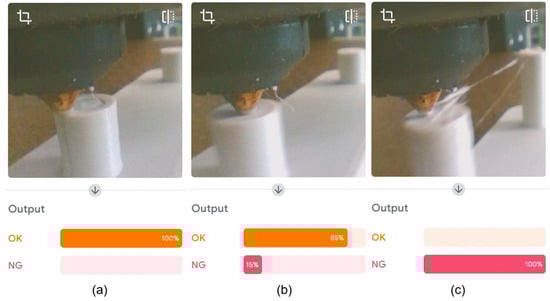 When detecting layer shifting defects, the results were very good and there was no misinterpretation of the images. As shown in Figure 14a, the camera successfully captured the correct printing process. In Figure 14b, an error was detected at a very early stage with a success rate of 76%. Figure 14c shows advanced print errors, which the camera detected and evaluated as errors with 100% success.