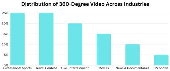 Distribution of 360° video applications across industries. The highest usage is observed in professional sports and travel content, highlighting the medium’s strong concentration within the entertainment and film sector. In contrast, the lowest adoption of 360° video is reported in news, documentaries, and TV shows.