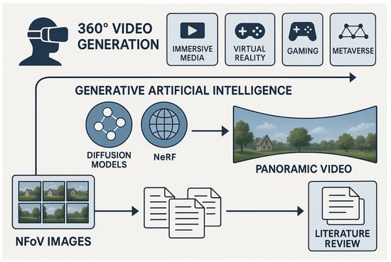 This research is based on a structured literature review of peer-reviewed and preprint publications from 2021 to 2025. The review focused on 360° video generation, panoramic vision, neural radiance fields (NeRFs), diffusion models [], and generative AI frameworks. Special attention was given to studies addressing sparse-input generation, such as synthesizing panoramic content from a limited number of static images or perspective views.