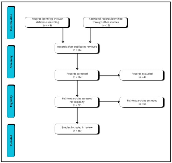 The literature selection process for this review followed a structured approach using the PRISMA (Preferred Reporting Items for Systematic Reviews and Meta-Analyses) framework. A total of 43 records were identified through database searches in IEEE Xplore, arXiv, and Google Scholar, with an additional 13 records identified through other sources such as academic recommendations and manual browsing. After removing duplicates, 56 records remained for screening. During the screening stage, four records were excluded based on a review of the titles and abstracts. The remaining 52 full-text articles were assessed for eligibility, from which 6 were excluded due to insufficient methodological detail or lack of direct relevance to 360° panoramic generation. The final review included 46 papers that contribute to the analysis of AI-driven approaches for 360° video and image synthesis. The PRISMA flow diagram in Figure 3 visualizes this process.