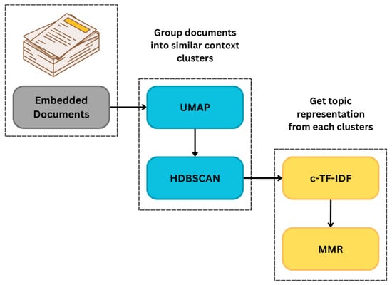 As shown in Figure 4, BERTopic works [,] by first embedding the text using a pre-trained language model. These embeddings are then reduced in dimensionality and clustered to discover patterns in the data. Each cluster is summarized with key terms using a class-based TF-IDF approach, allowing us to label and interpret the core ideas represented in each topic.