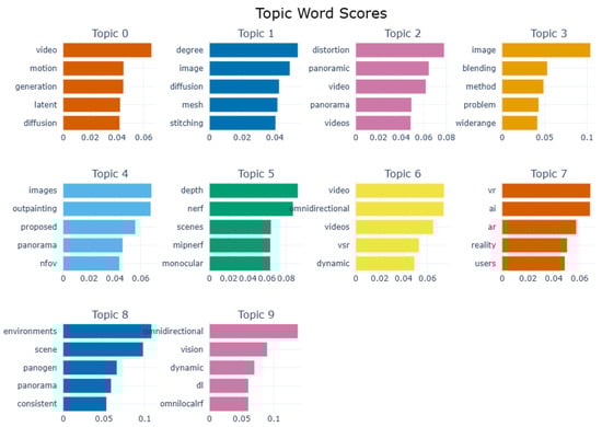 After applying this process to the collection of over 40 research papers, we identified 10 distinct topics. These ranged from 360° video generation and scene reconstruction to image outpainting and spherical vision techniques. The top-ranked terms for each topic are presented in Figure 5, providing a clear snapshot of the focus areas that emerged from the modeling []. This visualization highlights the semantic structure of current research, revealing that while some topics cluster around foundational techniques (e.g., NeRF-based depth modeling, diffusion-driven generation), others focus on application-oriented challenges such as VR/AR integration and panoramic video blending. These thematic clusters help contextualize the breadth of methods and objectives in the panoramic video generation literature.