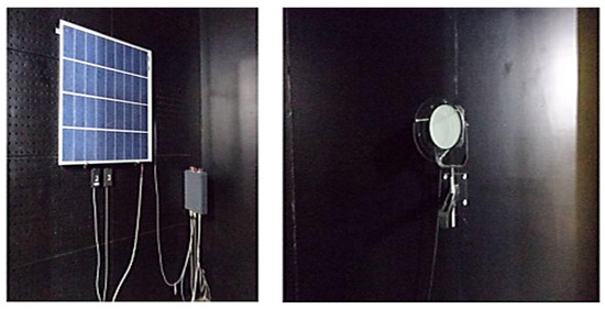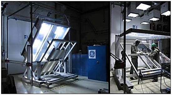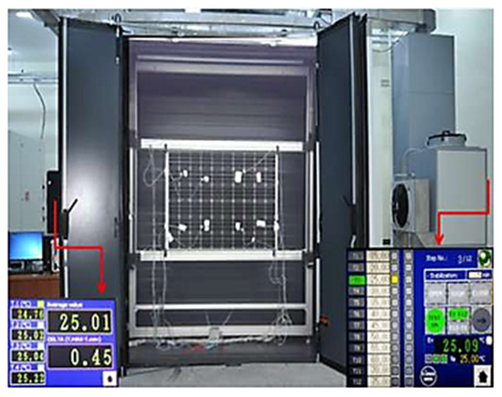 Ozcan, et al. [43] used a temperature-controlled solar simulator based on a xenon light source and equipped with radiation attenuator masks, in order to accurately analyze the effect of temperature on the electrical parameters of a single-crystal PV module. This simulator, shown in Figure 6, incorporates a closed thermal chamber with a quick-opening door designed to preserve the thermal uniformity on the surface of the tested modules. The spectral concordance of the simulator was evaluated using a set consisting of a spectroradiometer, optical incidence system, and dedicated software. To study the spatial distribution of the illumination provided by the simulator, an area of 22 m was divided into 64 equal segments, in accordance with the requirements of IEC 60904-9 [30]. The irradiance in each segment was measured using a specially designed PV cell (16 × 16 cm), positioned successively on each of the 64 zones, irradiated by the simulator, and then analyzed to extract the performance parameters. The electrical characteristics of a PV module made of monocrystalline silicon (m–Si) were measured at different illumination levels and temperatures. The temperature coefficients were evaluated using the interpolation method described in IEC 60891, based on a simple matrix linking irradiance and temperature.