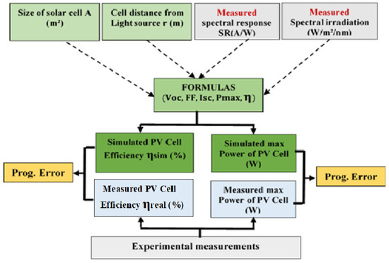 The light spectrum emitted by the simulator lamps is designed to be close to the actual solar spectrum, which improves the measurement accuracy. The cooling system maintains the modules at a stable temperature close to ambient conditions. The PV modules are fixed on a frame mounted on the collector surface, which can be tilted between 0° and 90°, thus allowing the angle of incidence between the active surface of the module and the light source to be changed. The main objective of this study was to estimate the performance ratio (PR) of different types of PV modules, regardless of their orientation or location. Apostolou et al. [38] proposed a simplified comparative model to estimate the performance of 12 commercial PV modules under indoor conditions. This model makes it possible to predict the performance of PV modules based on their distance from different light sources, whether artificial (fluorescent, halogen, or LED) or natural. The approach adopted is based on the combined use of two light sources: natural light, which may be insufficient indoors, and appropriate artificial lighting. The main objective of this work is to provide a design aid tool for integrated photovoltaic systems, optimized for use in indoor environments. The model is based on physical measurements of both natural and artificial indoor irradiance. The main input data include: module surface, spectral response (SR) of the device, indoor spectral irradiance, and distance between solar cell and light sources. The analytical model, developed in Microsoft Excel, allows calculation of solar cell efficiency and power output under specific indoor conditions, as shown in Figure 4 [39].