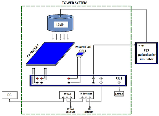 Luciani et al. [40], performed an indoor characterization to determine the correction parameters of PV modules in accordance with IEC 60891 [41]. To do this, a set of nine (9) PV modules was tested using a flash test bench based on a class A+ solar simulator (AM 1.5), manufactured by BERGER Lichttechnik. The experimental device, shown in Figure 5, consists of a pulsed solar simulator (PSS), solar pulsed charge system (PSL), infrared detector (IR), temperature sensor Pt100, computer with dedicated acquisition software for recording current-voltage (I–V) curves, and tower positioning system. The solar simulator incorporates an energy generator and a lamellar light source without optical elements, thus ensuring homogeneous and reproducible lighting. The PSL system, with three channels controlled by a processor, allows for load simulation and precise measurement of PV module performance. This device conforms to IEC 60904-1 [42] for the measurement of I–V curves. The I–V curves obtained under standard test conditions (STC) after the application of the determined correction parameters were compared with those measured using a commercial curve plotter, as reported in an earlier study [2].
