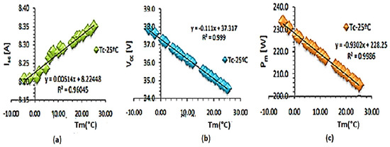 (a) Isc as a function of the temperature of the PV module at 1000 W/m2: determination of the temperature coefficient α; (b) Voc as a function of the temperature of the PV module at 1000 W/m2: determination of the temperature coefficient β; (c) Pm as a function of the temperature of the PV module at 1000 W/m2: determination of the temperature coefficient a [44].