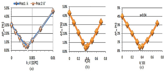 (a) Errors in maximum power (Pm) as a function of k and k′; (b) Errors in maximum power (Pm) as a function of Rs; (c) Errors in maximum power (Pm) as a function of Rs′ for an optimum value of parameter a [44].