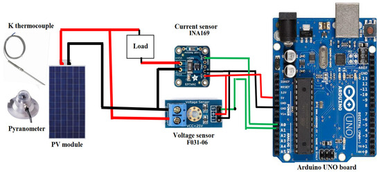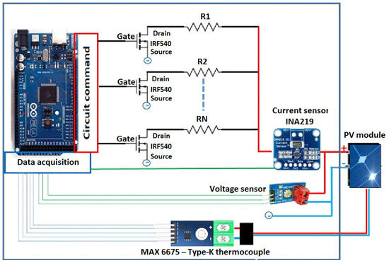 To overcome this limitation, Amiry, et al. [57] proposed a technique for automatic variation of the load resistance. The experimental device used includes a variable resistance, an Arduino Mega 2560 board, and several suitable sensors: current, voltage, irradiance, and temperature sensors (see Figure 11). The electronic diagram of the assembly is shown in Figure 12 and Figure 13. The surface temperature of the module is measured using a K-type thermocouple, and the irradiance is recorded using a pyranometer positioned in the module plane.