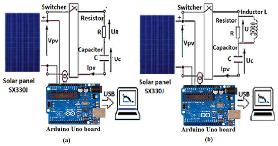 (a) Synoptic diagram of PV characterization performed using the RC method; (b) Synoptic diagram of PV characterization performed using the RLC method [61].