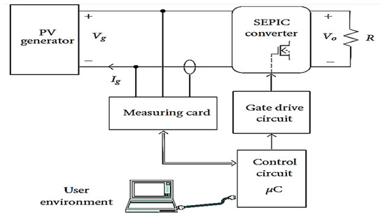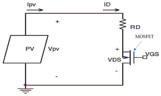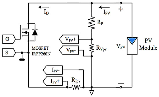 Other work, such as that of Kuai, et al. [62], implemented a test circuit based on a MOSFET operating in linear mode (see Figure 17), in order to continuously obtain the I–V and P–V curves to evaluate the performance of a photovoltaic installation. A block diagram of the device is shown in Figure 18.