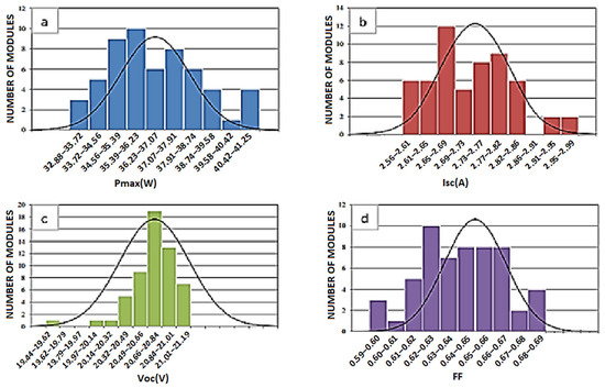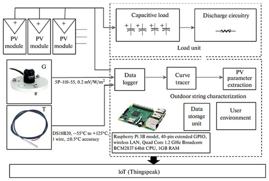 In addition, Gadong, et al. [24] relied on measurements of fundamental electrical parameters (Isc, Voc, Pmax) to characterize crystalline PV modules using a system with variable resistive load. Other authors, such as Silva, et al. [14], have proposed a model that takes into account UV radiation, visible irradiation, ambient temperature, and module temperature. Their method, based on the capacitive charge technique, uses a device connected to Wi-Fi for the real-time transmission of data to a computer.