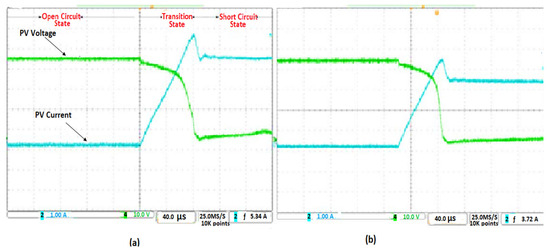 The current and voltage values were measured using dedicated sensors. At the start of the measurement, the activation of the relays created a low-load condition on the PV generator, which was equivalent to a short circuit. As the capacitor charges, the current decreases while the voltage increases. At the end of the charge, the current becomes zero, corresponding to the open-circuit condition.
