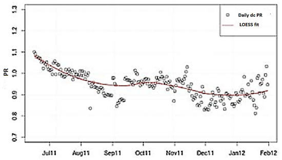 Photovoltaic (PV) technologies are becoming increasingly important for energy production [1,2,3,4,5,6,7]. However, the precise prediction of their performance under real conditions remains a major issue, especially since most manufacturers offer warranties of 25 to 30 years with a power decline of less than 20% during this period [8,9]. The reliability and longevity of PV modules are mainly determined by their energy performance [10,11], which is strongly influenced by environmental factors such as temperature and solar irradiation. Other factors, such as dust accumulation and degradation, also play important roles. Dust fouling of the modules reduces the received irradiance and increases their operating temperature, which can accelerate degradation mechanisms.