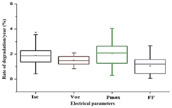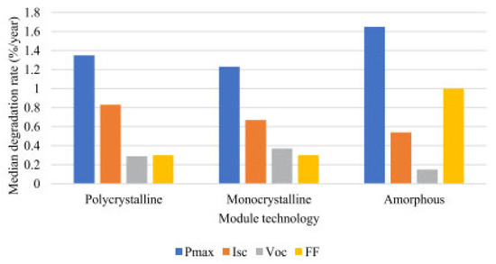 - Ishii, T.; Masuda, A. Annual Degradation Rates of Recent Crystalline Silicon Photovoltaic Modules. Prog. Photovolt. Res. Appl. 2017, 25, 953–967. [Google Scholar] [CrossRef]