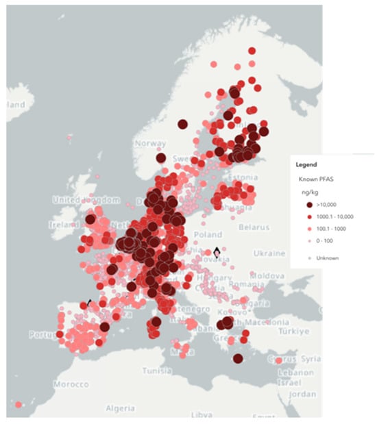Per- and polyfluoroalkyl substances (PFASs), anthropogenic hydrocarbon (C4–C18) compounds in which all hydrogen atoms in the alkyl chain are replaced by fluorine, have been detected in surface and groundwater worldwide, including drinking water supplies. As an example, Figure 1 reports known PFAS-contaminated sites in Europe, according to the European Environment Agency [1].