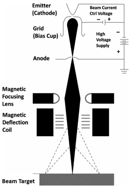 An E-beam device (electron beam accelerator) is schematized in Figure 2: a cathode in a sealed container under high vacuum releases electrons that are accelerated under high DC voltage or radiofrequency and are deflected to an exit window by electrostatic or magnetic fields. E-beam machines accelerate electrons to near the speed of light, achieving electron energies up to 100’s MeV. The electrons’ energy depends on the applied anode voltage and their quantity depends on the cathodic current intensity. Adjusting current and voltage allows for controlling beam penetration and the target-absorbed dose rate.