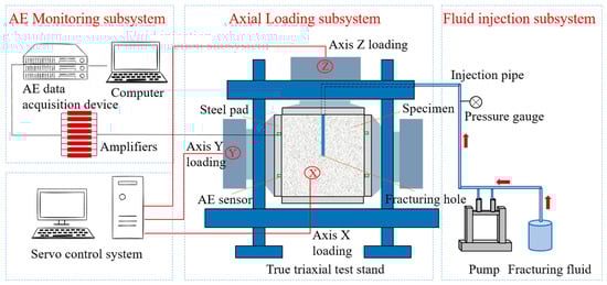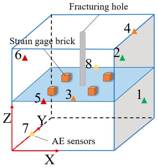 The true triaxial hydraulic fracturing experimental system (Figure 1 and Figure 2) consists of three integrated subsystems: a true triaxial servo loading system, a pump injection system, and a data acquisition system. Each subsystem plays a crucial role in replicating the complex conditions of subsurface fracture propagation under controlled laboratory conditions. The true triaxial servo loading system applies isotropic confining pressure via hydraulic oil with maximum principal stress of 25 MPa in three orthogonal directions and control accuracy of 0.25% F.S. in full scale. The system’s ability to uniformly apply pressure in multiple directions is critical for simulating the triaxial stress state in underground environments. The pump injection system has a maximum pressure of 50 MPa, maximum flow rate of 100 mL/min, and flow measurement accuracy of ±1% F.S. The pump pressure and flow rate are monitored and stored with a sampling interval of 10 ms. The data acquisition system includes an AE monitor and a dynamic strain monitor. The AE monitor has eight channels, with a frequency range of 1 kHz to 2.5 MHz and accuracy of ±0.01% F.S. The dynamic strain monitor has 64 channels with a maximum sampling rate of 1 kHz. The spatial arrangement of strain bricks and AE sensors is illustrated in Figure 3. These monitoring measurements are carefully designed to capture the full spatial distribution of strain and acoustic activity during the experiment.