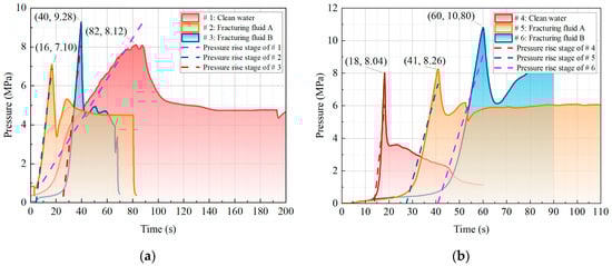 In the first stage, the fluid is injected into the pressure borehole, causing the pressure in all curves to rise until reaching its peak. Subsequently, a sharp pressure drop occurs as cracks initiate and propagate within the specimen. During this stage, crack propagation accelerates rapidly, often penetrating the specimen within a very short time, leading to a drastic decline in pump pressure. The dotted line in Figure 4 represents a least-squares fit of the first-stage curve, with its slope indicating the pressure rise rate per unit time. A steeper gradient corresponds to a shorter time required for the pressure to peak, facilitating the attainment of fracture initiation pressure in the roof strata. The numbered points in Figure 4 denote pressure peaks, which reflect the fracture initiation pressure. As illustrated in Figure 4a, Specimen #1 exhibits a peak pressure of 8.12 MPa, while Specimens #2 and #3 show peak pressures of 7.10 MPa and 9.28 MPa, respectively. The pressure rise rates, ranked from smallest to largest, are 0.10 MPa/s (Specimen #1), 5.52 MPa/s (Specimen #2), and 5.55 MPa/s (Specimen #3).