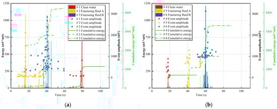 AE monitoring serves as a widely adopted technique for characterizing hydraulic fracture propagation at the laboratory scale [,]. To investigate the fracturing processes across different specimens, we analyzed three key AE parameters: amplitude, energy, and cumulative energy (Figure 5). Among these, AE energy represents a particularly significant parameter as it directly correlates with the extent of internal rock damage. The unit of AE energy is mV×ms, which is calculated by integrating the voltage signal over time. Typically, high-energy AE events correspond to macroscopic fracture formation or significant structural failure, while low-energy events are associated with microcrack initiation or localized damage [,,]. This energy-based classification enables quantitative assessment of damage progression during the fracturing process, providing valuable insights into the specimen’s failure mechanisms.