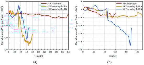 The minimum principal strain curves for different fluid media at UCSs of (a) 14.1 MPa and (b) 24.4 MPa.