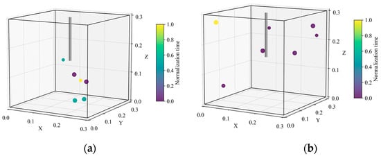 When combined with the analysis of the fracturing medium, a progressive increase in location points is observed from clear water (Figure 7a) to fracturing fluid A (Figure 7b) and then to fracturing fluid B (Figure 7c) in the location map, accompanied by gradually intensifying acoustic emission activity. This demonstrates that the fracture propagation process induced by the fracturing fluid is more vigorous than that achieved with the clear water medium. Moreover, the positioning sites in Figure 7a are predominantly concentrated in small areas. In contrast, Figure 7b,c show an increasing number of positioning points near the boundary with broader spatial distribution, indicating that the new fracturing fluid increases the fracture extension area. These results clearly show that, compared to the clear water medium, the new fracturing fluid produces a greater number of fracture points, more intense acoustic emission activity, and more vigorous fracture propagation.