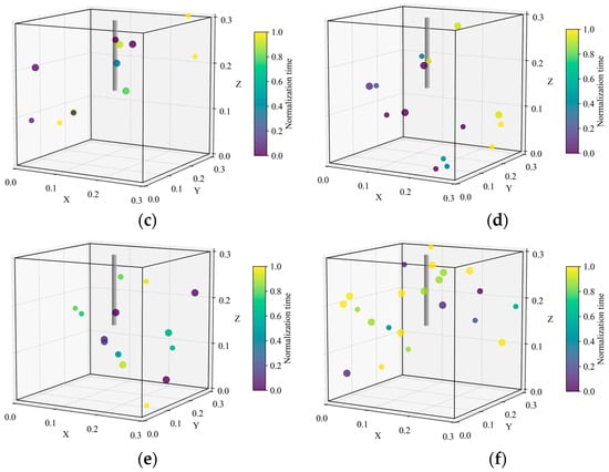 AE events location results. (a–f) represent Specimens #1 to #6.
