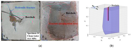 Physical and spatial diagrams of the fracture extension for Specimen #1. The purple area indicates the expansion area of the fracturing fracture. (a) Fracture morphology diagram. (b) Three-dimensional fracture morphology diagram.
