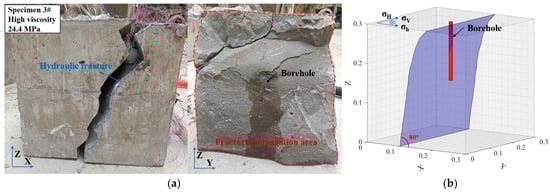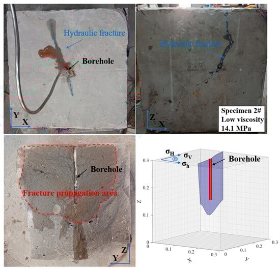 After completing the triaxial hydraulic fracturing experiment, the specimens were dissected along the direction of the maximum principal stress. Upon splitting, the fracture morphology was recorded immediately to prevent the fracturing fluid’s water marks on the specimen surface from drying out and becoming unrecognizable. The hydraulic fracture morphology can be traced using tracers to investigate the macroscopic fracture propagation under different fracturing media and coal-seam roof-strength conditions. In this study, the vertical stress (σz) is applied in the Z-direction, the maximum horizontal in situ stress (σH) in the Y-direction, and the minimum horizontal in situ stress (σh) in the X-direction. Specimens #1 to #3 have a UCS of 14.1 MPa, while Specimens #4 to #6 exhibit 24.4 MPa. All specimens are subjected to the same fracturing fluid flow rate.