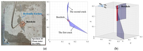 Figure 11 presents the hydraulic fracture morphology of Specimen #4, which exhibits higher compressive strength. Results indicate that two main vertical hydraulic fractures were formed after fracturing with clear water, both symmetrically distributed about the borehole axis. The first fracture initiates from the bottom of the borehole and extends vertically downward, ultimately penetrating the lower boundary of the specimen. This fracture measures 18 cm in length and 15 cm in width, with an inclination angle of 55° relative to the direction of the maximum principal stress. Morphologically, the hydraulic fracture exhibits a trapezoidal shape, forming a single vertical fracture with significant propagation distance. The second fracture originates from the borehole and extends laterally toward one side of the specimen. It propagates vertically upward, fully penetrating the XY upper surface of the specimen, resulting in a single vertical crack with an approximately square morphology. Compared to the first fracture, this crack is shorter, measuring 15 cm in length, while its width matches the borehole length (15 cm). Notably, this fracture propagates nearly parallel to the maximum principal stress direction, with a deviation angle of 0°.