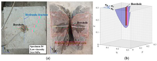 The hydraulic fracturing test procedure is as follows: (1) Specimen Preparation and Instrumentation: Position the specimen in the fracturing chamber, mount eight AE probes on all four specimen sides with coupling agent, and connect strain gauges to the strain monitoring system; (2) Fracturing Fluid Preparation: Add red tracer dye to the fracturing fluid for fracture visualization; (3) Confining Pressure Application: Apply triaxial confining pressure to predetermined values (σh, σH, σv); (4) Fracturing Initiation: Simultaneously activate pump injection system (constant flow rate: 53 mL/min), AE monitoring system, and strain monitoring system; (5) Fracture Propagation Monitoring: Continue injection until either fracturing fluid breakthrough occurs or pump pressure stabilizes (±2% fluctuation over 30 s); (6) Termination Criteria: Physical fracture is confirmed when pump pressure drops abruptly to the minimum principal stress level or hydraulic fractures fully propagate through the specimen; then, immediately shut down all monitoring and injection systems.