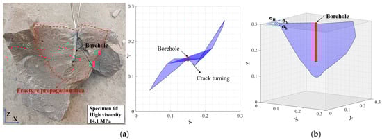 Physical and spatial diagrams of the fracture extension for Specimen #6. (a) Fracture morphology diagram. (b) Three-dimensional fracture morphology diagram.