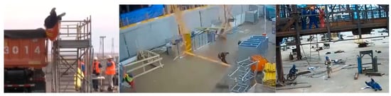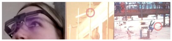 A sequence of four films containing sample scenes from construction accidents was created. The images were displayed with 5 s breaks (Figure 5). After watching the individual films, the subject was asked to provide the number of people visible in the film who did not react correctly to the accident presented in the material displayed. As before, a film was introduced in which it was impossible to indicate people other than the victims of the accident. The aim of this study was to identify the order of places that the subject was looking at.