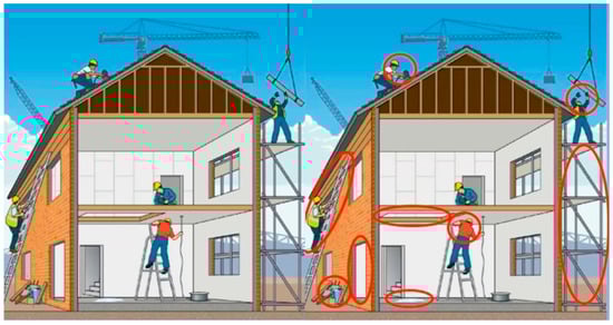 A sequence of 10 drawings, standardized in terms of color and size, containing sample scenes from construction sites was created. The images were displayed for 10 s with 5 s breaks between displays. The additional first two introductory drawings contained information on what the subject should pay attention to (Figure 4).