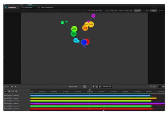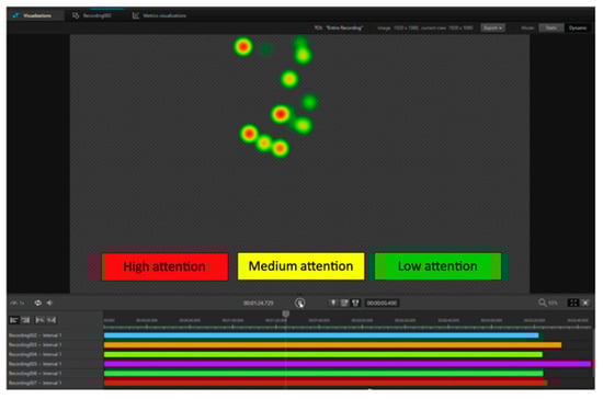 To better describe the pattern of visual search and the strategy of the subjects, it is necessary to examine the order of places on which the workers focus. The fixation sequence is a sequence indicating the locations of fixations generated by the participant in chronological order during the visual search task. This study also identified potential additional parameters that can be analyzed with a larger research sample. These parameters are search time, time to first fixation, number of fixations and fixation ratio, number of runs, average fixation duration, visual attention index, special fixation density, first fixation accuracy index, fixation sequence, intersection coefficient, saccade velocity, pupil diameter, number of blinks, and duration. Additionally, during the development of the results, visualizations were generated and developed in the Tobii Pro Lab software, showing where individual study groups focused their gaze most often (Figure 6) and in which places and at what speed the gaze of individual study participants moved (Figure 7).