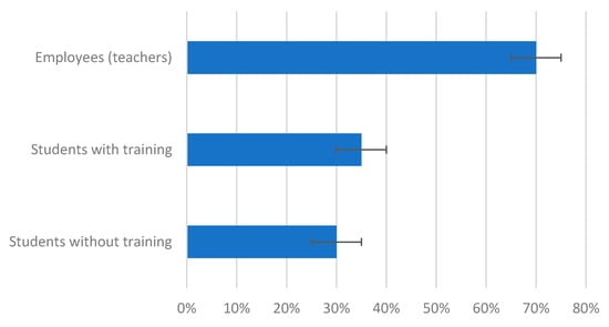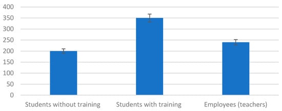 As can be read from the above table, the highest detection of irregularities in the presented materials during the static eye-tracking test was demonstrated by the “Employees” group with a level of detecting errors and irregularities at the level of 70%. The next group were trained students participating in the training (35%), and finally students who were presented with research materials for the first time (30%). The second factor that should be noted is the fixation time (FT), which, in the case of the group of students without training, is at the level of 200 ms. This is related to the lack of appropriate knowledge to recognize dangerous situations in the presented materials. This parameter significantly increases to 350 ms in the group of trained students, which is due to the acquired knowledge and the desire to use it in interpreting the presented materials and finding as many irregularities as possible. The last group, with a result of 240 ms, i.e., teachers, in addition to their possessed and established knowledge, already have appropriate practice (reflected in 70% detection of irregularities); therefore, the fixation time is significantly shortened. This also shows how important the repeatability of training and acquired practice is for appropriate response in the conditions of the actual construction site.