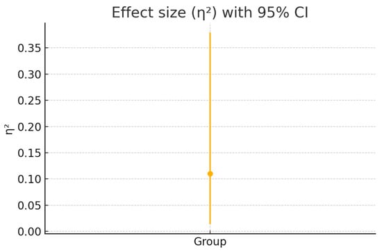 Effect size (η2) plot with 95% confidence interval shows how much influence the variability of fixation time has on the group membership time (Figure 10). The confidence interval confirms the stability and significance of this effect. Tukey post hoc comparison matrix (p-value) shows the significance levels of differences between all pairs of groups. Light colors (lower p-values) indicate statistically significant differences (Figure 11).