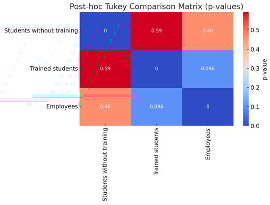 - Students without training vs. Employees: no significant difference (p ≈ 1.0).