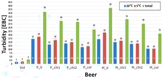 Turbidity of produced beers (n = 3, α = 0.05; homogenous groups of results within the given parameter are indicated by letters).